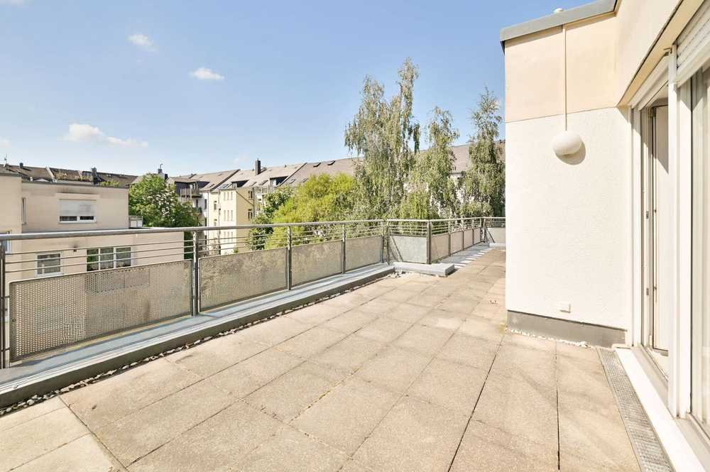 Besonderes Highlight ist die große Dachterrasse, die sowohl vom Wohnzimmer als auch vom Schlafzimmer betreten werden kann und den perfekten Ort für entspannte Stunden im Freien bietet. Die moderne Küche ist hell gestaltet und bietet Platz für einen kleinen Essbereich. Das Tageslichtbad verfügt über eine Badewanne, eine separate Dusche sowie einen praktischen Waschmaschinenanschluss. Dank zahlreicher Fenster mit Außenrollläden ist die Wohnung lichtdurchflutet und gut gleichzeitig vor Wärme und Einblicken geschützt. Der zentrale Flur verbindet alle Räume harmonisch miteinander und schafft so eine stimmige Wohnatmosphäre.