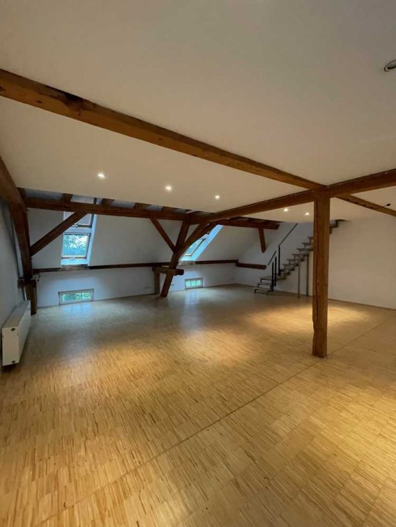 Die wunderschöne Dachgeschoss-Maisonettewohnung besticht durch ihre großzügige und offene Raumaufteilung. Von der Wohnungstür gelangt man in den Flur, wo sich ein schönes helles Badezimmer mit Dusche und Waschmaschinenanschluss sowie ein geräumiger Abstellraum befinden. Von dort gelangt man in den einladenden offenen Wohnbereich mit vollausgestatteter Einbauküche, die zum gemeinsamen Kochen einlädt. Auf dieser Ebene befindet sich ein zusätzlicher Raum, welcher sich als Arbeits-/Kinder- oder auch Schlafzimmer eignet. Über eine offene Treppe gelangt man in die obere offene Ebene -denkbar als Schlafzimmer oder Arbeitsbereich - mit einem großzügigen Badezimmer mit großer Eckbadewanne. Beide Bäder verfügen über Tageslicht. Die offene Raumaufteilung bietet verschiedenste Gestaltungsmöglichkeiten! Die schönen Holzbalken verleihen der gesamten Wohnung einen einzigartigen Charme und die Deckenspots sorgen für eine behagliche Beleuchtung. Zur Wohnung gehört auch 1 Tiefgaragenstellplatz.