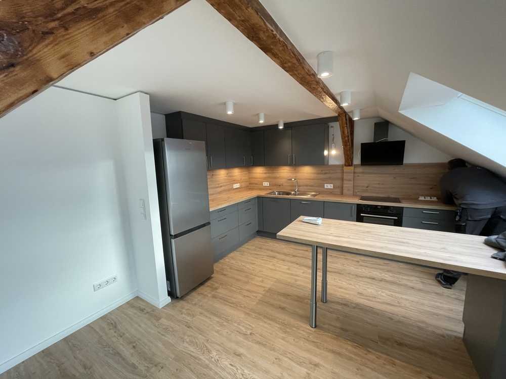 Garten und einen Blick über die Dächer der Stadt bis in den Elm. Die neue Wohnung steht ab sofort zur Besichtigung und zum Erstbezug zur Verfügung. Zu der Wohnung zählen zwei Schlafzimmer, ein offener Wohn-, Essbereich mit geräumigem Süd-Balkon und eine offene Empore, die über eine Wendeltreppe erreicht wird und mit exklusivem Blick über die Stadt Platz für Homeoffice und Gästewohnen bietet. Das neue Badezimmer hat neben der Dusche auch eine gesonderte Badewanne. Zum Apartment gehört auch ein Balkon, auf dem es sich wunderbar vom Alltag erholen lässt. Stauraum für Küchenutensilien bietet die neue Einbauküche mit Induktionsherd etc. Auch in dem Keller finden Sie weitere Abstellmöglichkeiten.