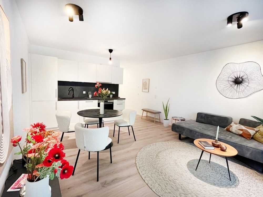 Diese lichtdurchfluteten Wohnungen überzeugen durch einen eleganten Vinylboden in heller Holzoptik und freundlich geflieste Badezimmer. Zur Ausstattung gehört eine moderne Einbauküche mit allen Elektro-Großgeräten. Für ein angenehmes Wohnklima sorgt die Fußbodenheizung.