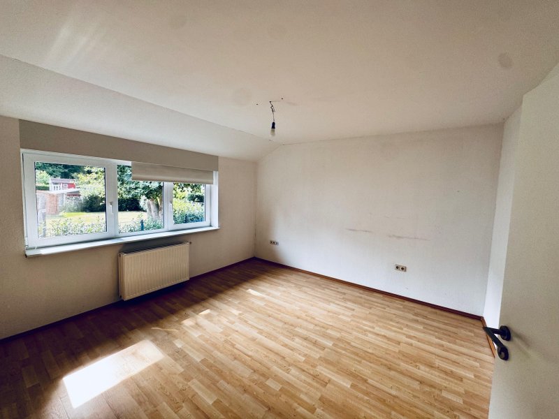 Im Erdgeschoss befindet sich ein praktischer Hauswirtschaftsraum, die Wohnräume sind in der 1. Etage. Hinauf führt eine gerade Treppe mit 16 Stufen. Vom Flur aus gelangen Sie in zwei gut geschnittene helle Zimmer, eine geräumige Küche mit Einbauküche und ein großzügiges Badezimmer mit Dusche.