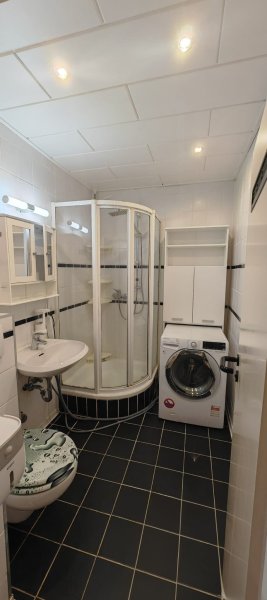 ein Badezimmer mit Dusche und Waschmaschinenanschluss,