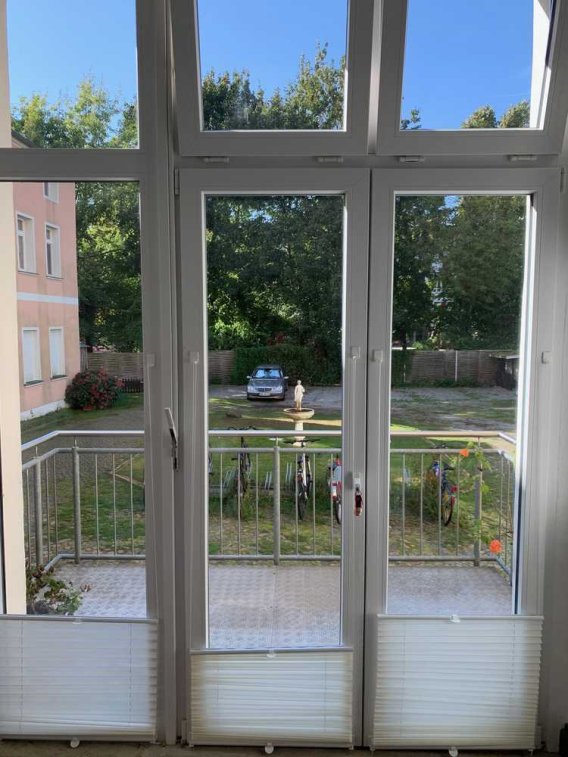 Zentraler Flur, 2 Zi. straßenseitig (rd. 15+18 qm) + Sonne bis Mittag, rd. 10 qm Küche u. Wozi. (rd. 17 qm) + Balkon hofseitig mit Grünblick + Sonne ab Mittag, innenliegendes Duschbad mit Glas-Element, WC + Waschbecken; alle Räume sind durch große Fenster (str.seitig mit Jalousie) gut belichet; der Fußboden wurde wärmegedämmt und mit OSB-Holz-Tafeln belegt.