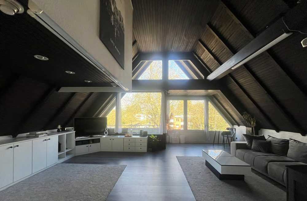 erwartet dich ein lichtdurchfluteter Grundriss mit offener Küche, rund 4 m Deckenhöhe im Wohnzimmer und stilvollen, dunkel gestrichenen Dachschrägen.