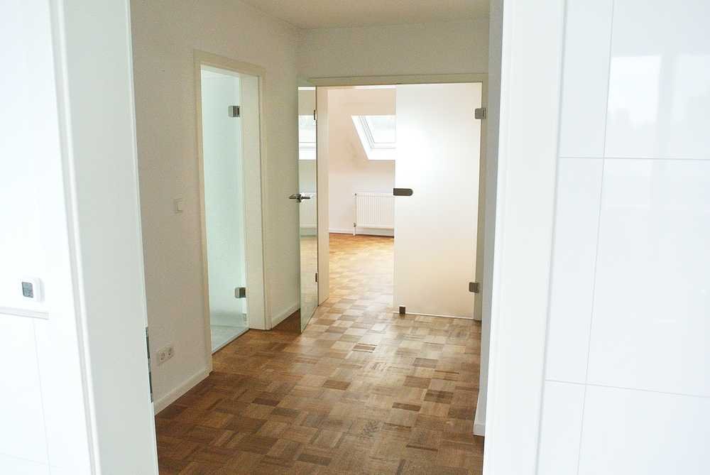 Helle, moderne Dachgeschosswohnung in ruhigem 3-Familienhaus. Wohnung wurde 2018 komplett saniert. Zentraler Flur mit Glastüren zum Wohnzimmer. Komplette Einbauküche mit Frühstücksplätzen. Fenster teilweise mit Jalousien, elektrische Rollläden. Bad mit modernen Objekten, Dusche, WC, Badewanne, Waschtisch. Parkett-Fußboden in Wohnräumen. Das Haus verfügt über eine moderne Gasheizung und hat eine Satelliten-Gemeinschaftsantenne. Ein großer Kellerraum, Waschküche mit Stellplatz für Waschmaschine und Trockner.