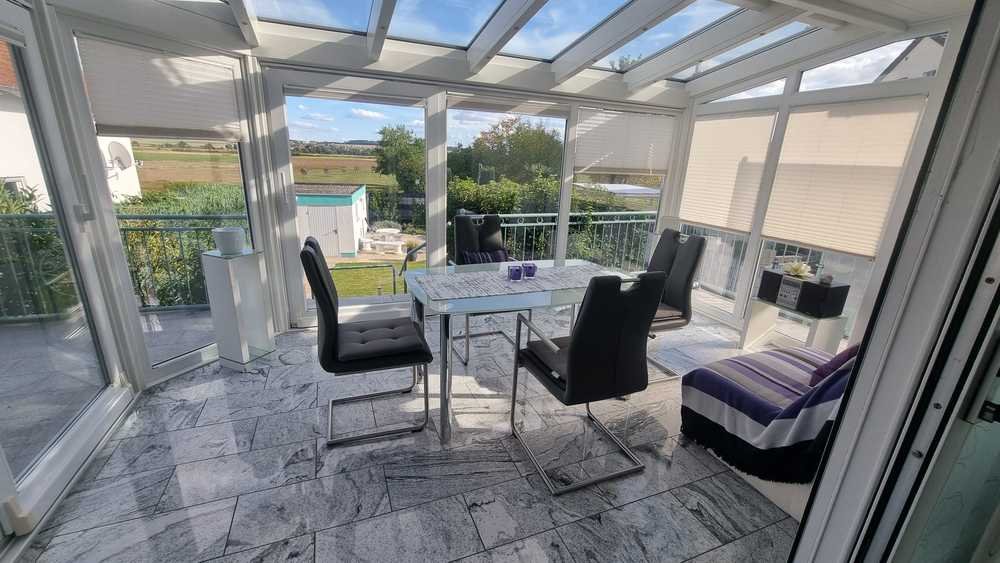 Eingangsbereich, Diele, Wohnzimmer mit offenem Kamin, Wintergarten mit Klimaanlage, Schlafzimmer, Büro, Küche mit hochwertigen Geräten von Miele, Badezimmer mit Dusche und Handtuchwärmer und einem Gäste WC.