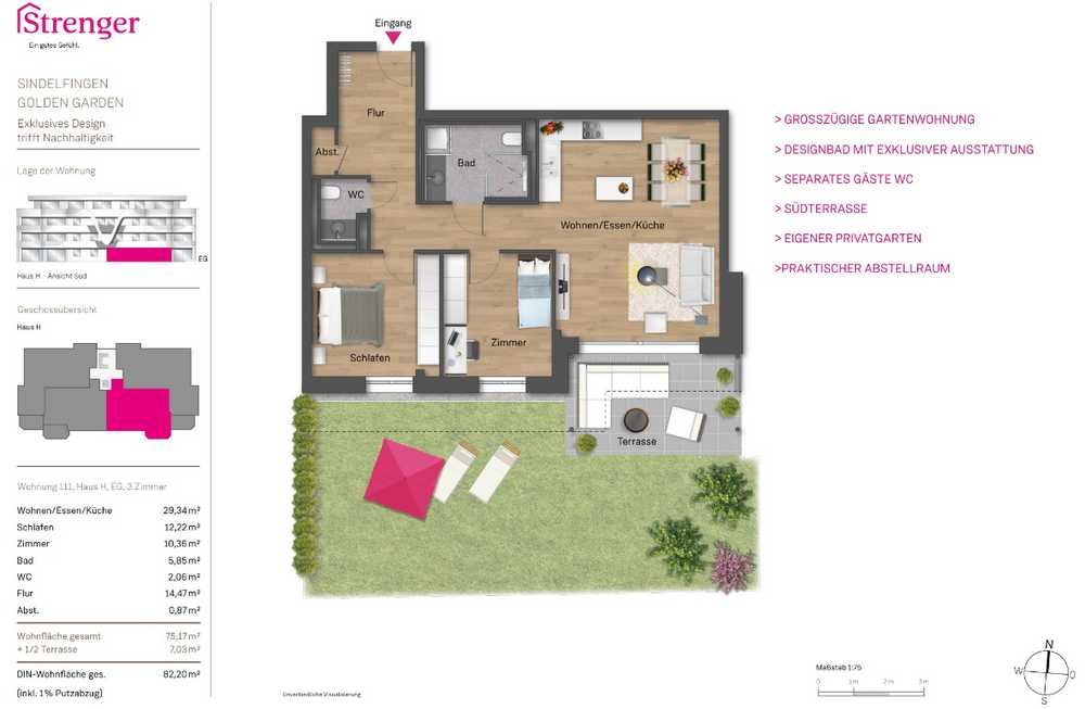 Das lichtdurchflutete Wohnzimmer und die beiden Schlafzimmer sind zum Park gewandt. Es gibt ein Gäste-WC, einen Abstellraum, einen eigenen Garten mit großer Terrasse, die zum Entspannen einlädt. Ein geräumiger Keller, der TG-Platz mit Wallbox und ein großzügiger Raum mit Fahrradständern runden das Angebot ab.