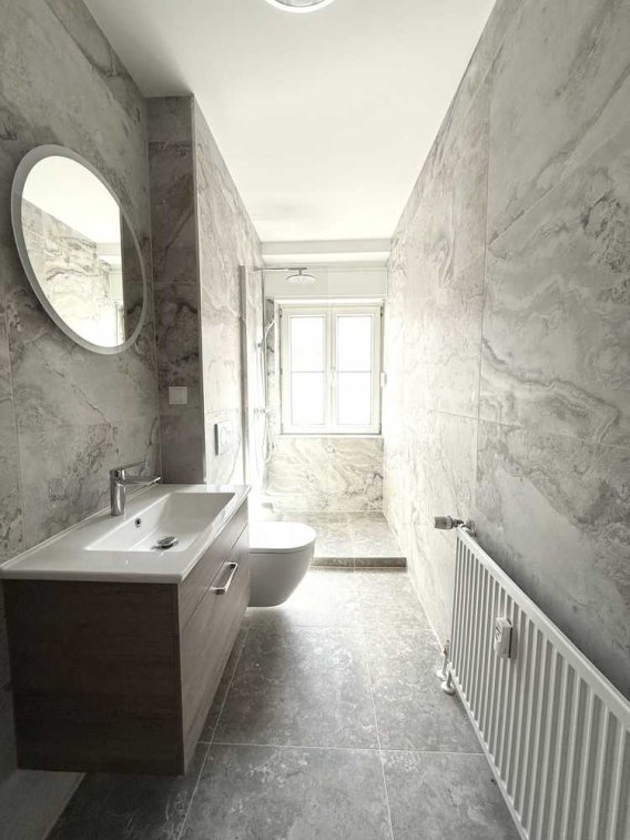 Das Badezimmer ist ein echtes Highlight: modern gefliest in Marmoroptik, ausgestattet mit einer großzügigen Regenfalldusche, einem praktischen Waschbeckenunterschrank und einem großen, modernen Spiegel.