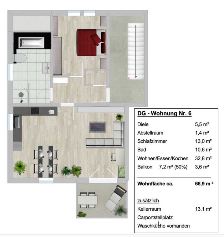 Ein eigenes Kellerabteil, ein Carportstellplatz sowie ein Gemeinschaftsraum mit sechs Anschlüssen für Waschmaschinen und Trockner runden dieses tolle Angebot ab.