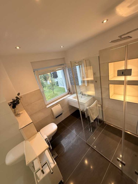 LED-Einbauspots, Badschnellheizer, Waschbeckenunterschrank und ein modern gestaltetes Ambiente laden zum Wohlfühlen ein.