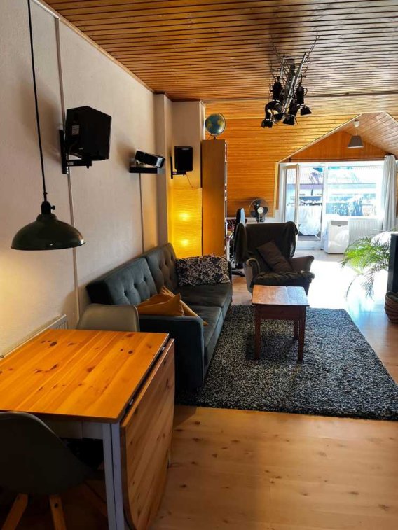 Die Wohnung ist ideal für eine Einzelperson. Sie liegt im Dachgeschoss eines Einfamilienhauses. Die beiden unteren Etagen werden von einer freundlichen Familie bewohnt, zu der auch ein Hund gehört.