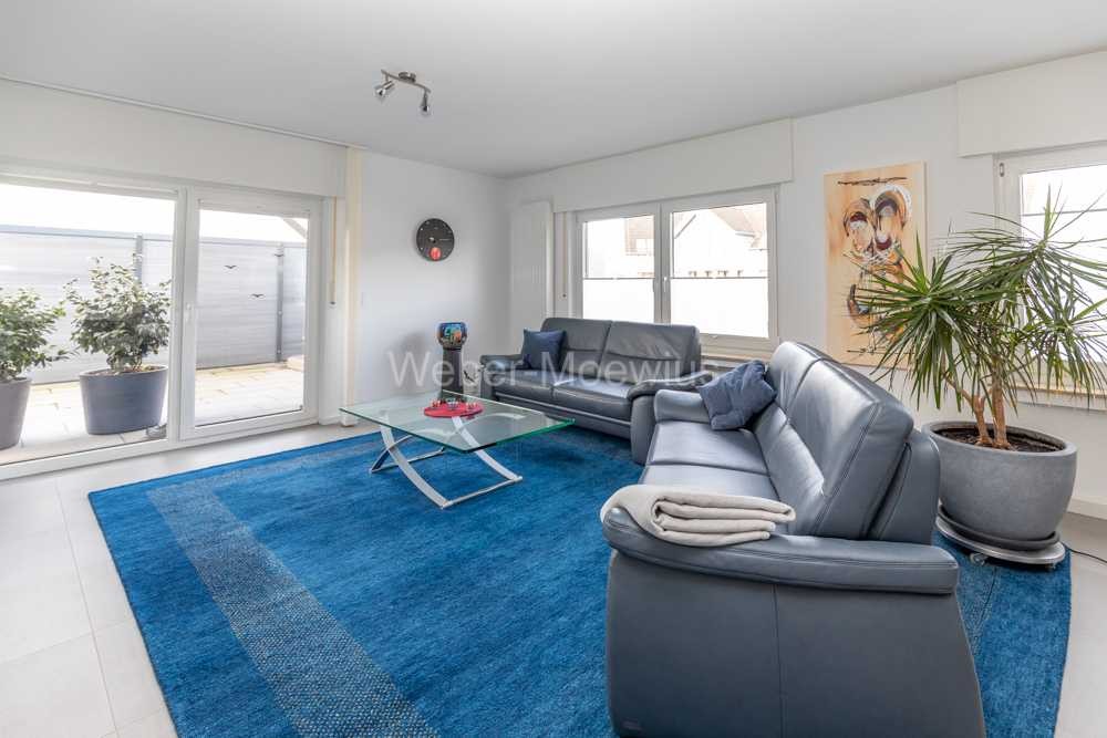Der lichtdurchflutete Wohnbereich bietet Zugang zur teilüberdachten Terrasse mit Sichtschutz und Markise. Bei schönem Wetter erweitert sie wunderbar den Wohnraum.