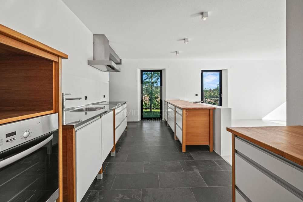 Der Eingangsbereich empfängt dich mit großzügigen Fensterfronten und viel Tageslicht. Im Erdgeschoss öffnet sich die Küche direkt zum Wohn- und Essbereich – ideal für gemeinsames Kochen und gesellige Abende. Ein Kamin sorgt dabei für gemütliche Stunden. Von hier aus gelangst du auf die große Terrasse und in den Garten, der mit seiner Weite und seiner exklusiven Bepflanzung ein echtes Highlight ist.