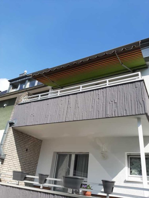 großer Balkon mit Markise, Außenbeleuchtung und Steckdose