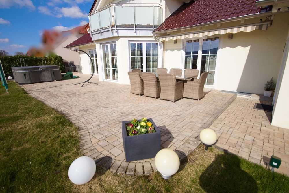 Zu dieser Wohnung gehören außerdem noch eine geräumige Doppelgarage und ein kleines Gartenhaus. Die Außenanlage ist liebevoll angelegt und besteht aus einem schönen Vorgarten, einer großzügigen Einfahrt und über einen Garten samt einer Terrasse, die sich auf der Rückseite des Hauses befinden.