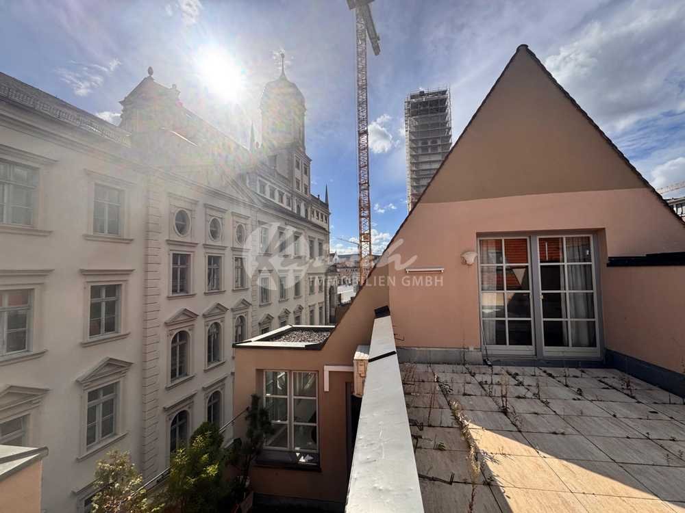 Die Wohnung erstreckt sich über zwei Ebenen und besticht durch ihre durchdachte Raumaufteilung sowie die Kombination aus Charme und Funktionalität. Besonders hervorzuheben ist die große Dachterrasse mit direktem Blick auf das Augsburger Rathaus und den Rathausplatz – ein echtes Highlight und in dieser Lage eine Rarität. Eine zweite, kleinere Terrasse auf der unteren Ebene ergänzt das Freiluftangebot perfekt.