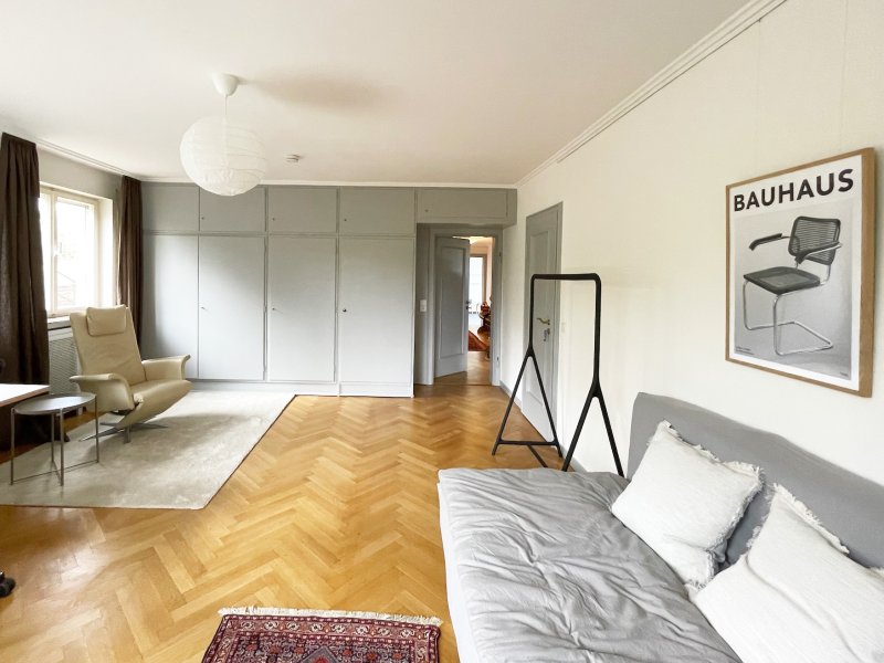 Dein helles Zimmer ist ca. 27m2 groß und verfügt über Eiche-Echtholzparkett. Das Zimmer ist möbliert mit Bett, Schreibtisch und großem Einbauschrank. Ebenso gibt es einen gemütlichen Sessel zum Lesen.