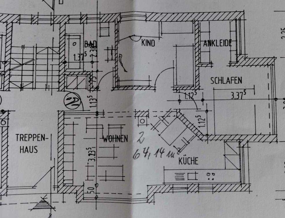 Wohnküche, Schlafzimmer, Kinderzimmer/Büro, Badezimmer mit Badewanne und WC.