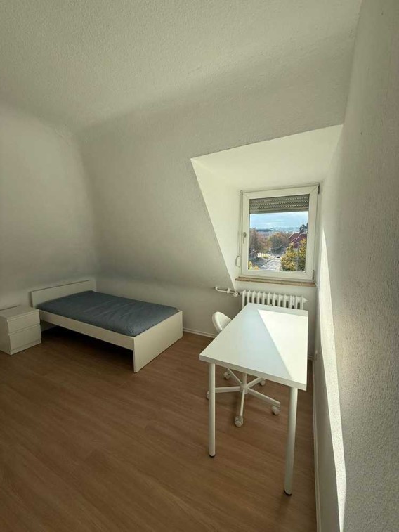 Das helle Dachgeschosszimmer mit ca. 12 m² Wohnfläche ist vollständig möbliert und bietet alles, was man für einen entspannten Start braucht – Bett, Kleiderschrank, Schreibtisch und Stuhl sind bereits vorhanden.