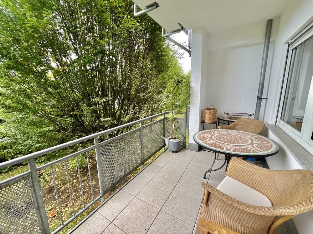 Vom Balkon aus eröffnet sich ein freier Blick ins Grüne, sodass man den Feierabend entspannt genießen kann.