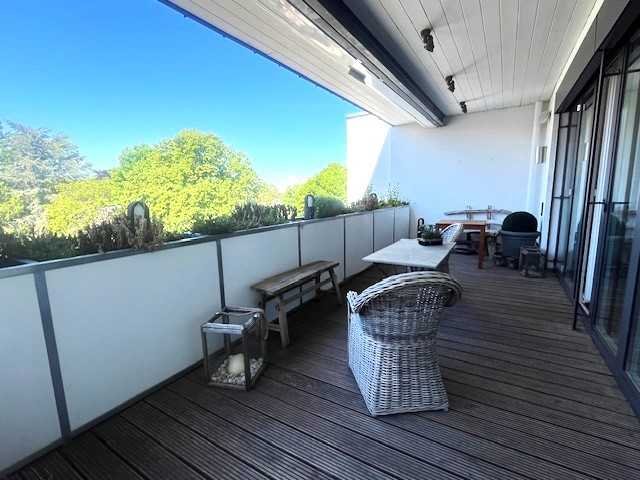 Die Penthousewohnung befindet sich in einem neuwertigen Mehrfamilienhaus mit insgesamt 6 Mietparteien. Der Aufzug führt direkt vor die Wohnungseingangstüre. Für die Penthousewohnung wurde das gesamte Dachgeschoss ausgebaut, und das Dach bis in den Dachspitz offen gestaltet, so dass hohe Decken von bis zu ca. 5 m entstanden sind. Durch die umlaufend bodentiefen Fenster sind alle Räume hell und lichtdurchflutet. Die Lichtverhältnisse können individuell an jedem Fenster durch elektrische Außenjalousien gesteuert werden. Die hohen Decken und die großen Fensterflächen vermitteln zusammen mit dem hochwertigen Parkettboden ein ganz besonderes Wohngefühl. Offen gestaltet, bilden Küche und Essplatz direkt an der Loggia mit dem Wohnbereich am Kamin das Herzstück der Wohnung. Das Elternschlafzimmer verfügt über einen 4 m langen Einbaukleiderschrank. Das Badezimmer en suite hinter einer Wandscheibe ist weiß gefliest mit großer Dusche. Im rückwärtigen Teil der Wohnung befinden sich ein weiteres Wohn- oder Arbeitszimmer, ein zweites Schlafzimmer, Badezimmer, Hauswirtschafts- und Abstellraum. Im Hauswirtschaftsraum ist eine kleine Küchenzeile inklusive Waschmaschine installiert. Durch den Abstellraum (der dann wegfiele) ist ein zweiter Wohnungseingang möglich. Im überdachten und abgeschlossenen Innenhof befindet sich ein großer überdachter Stellplatz mit einem separaten Hauseingang neben dem Stellplatz. Der Aufzug neben diesem Hauseingang führt direkt vor die Wohnungseingangstüre des Penthouse. Die Wohnung eignet sich für einen 2- Personenhaushalt genauso, wie für eine Familie mit Kindern. Grundsätzlich ergeben sich durch die beiden separaten Bereiche viele Möglichkeiten einer individuellen Nutzung.