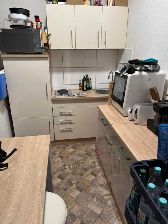 Beim Betreten der Wohnung gelangen Sie vom Flur direkt in die Küche mit moderner Einbauküche, ausgestattet mit Kochfeld und Kühlschrank. Von dort aus öffnet sich der freundliche, lichtdurchflutete Wohnraum.