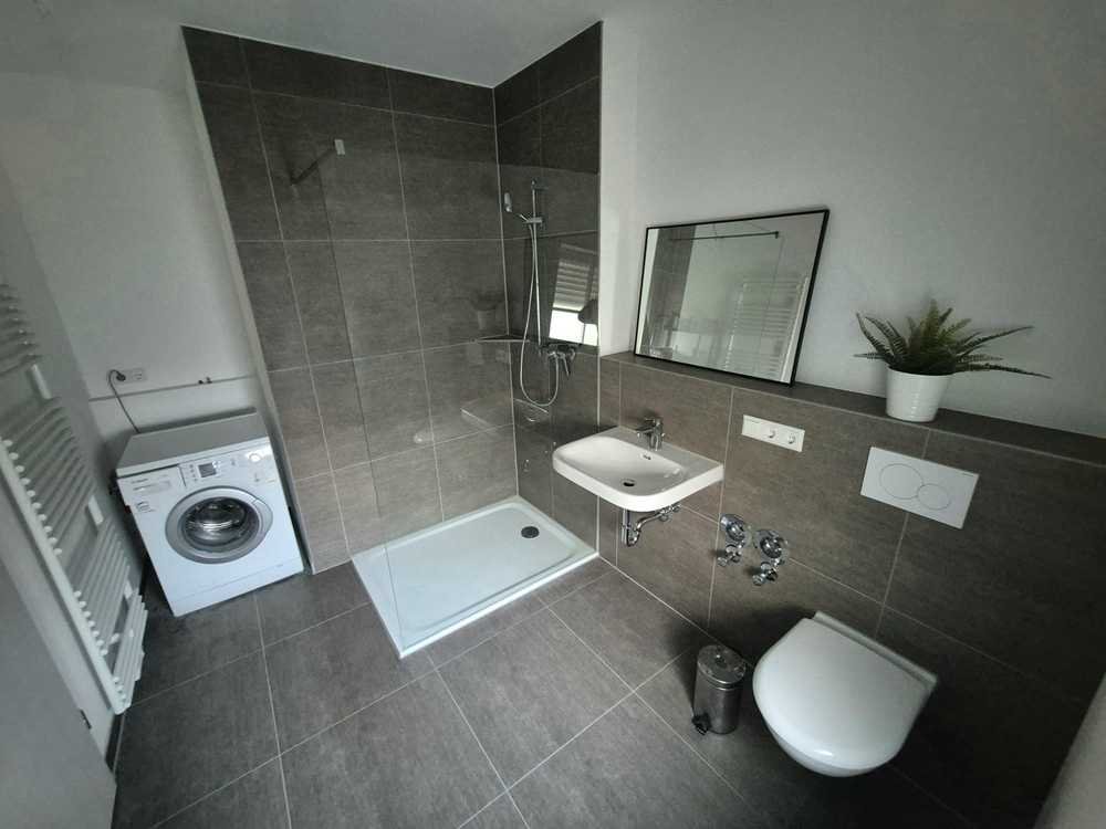 Die helle und lichtdurchflutete Wohnung besteht aus einem kleinen Abstellraum, Bad mit offener Dusche inkl. Anschluss für Waschmaschine und Trockner.