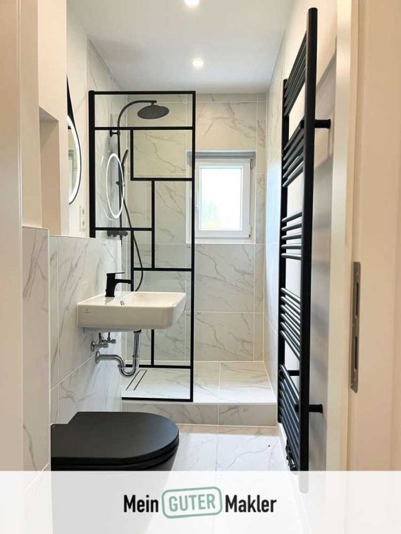 Das moderne Tageslichtbad ist nicht nur funktional, sondern auch ästhetisch ansprechend. Es überzeugt mit einer großen Regendusche, einem LED-Spiegel, einem Handtuchheizkörper und edlen Fliesen in Marmoroptik.
