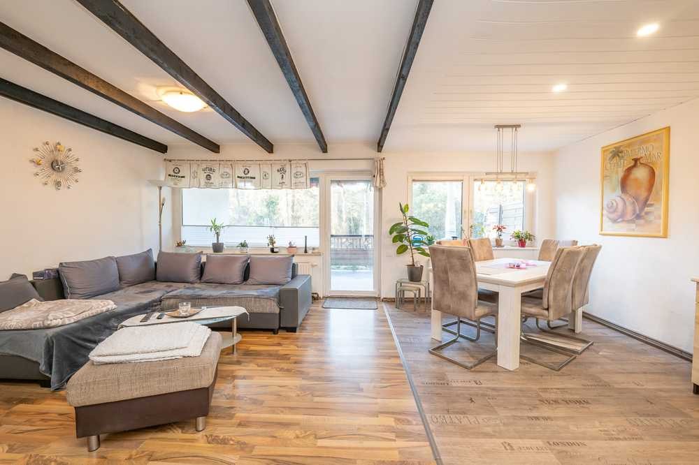 Im Erdgeschoss befinden sich der Eingangsbereich, ein Gäste-WC, die Küche sowie der helle Wohn- und Essbereich mit großen Fenstern und freiliegenden Holzbalken. Von hier führt eine Tür auf die überdachte Terrasse mit Markise – ideal, um draußen zu sitzen und den Blick in den Garten und den angrenzenden Wald schweifen zu lassen.