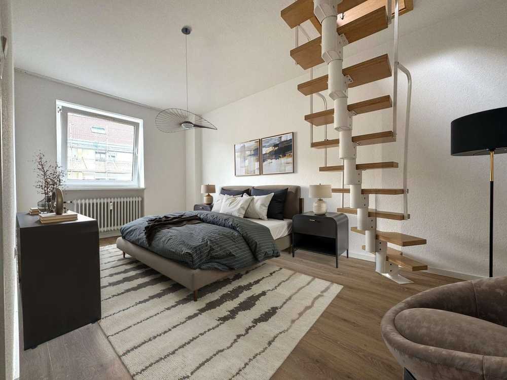 Gegenüber der Eingangstür befindet sich das gemütliche Schlafzimmer, das nicht nur Ruhe und Rückzug verspricht, sondern auch den Zugang zur charmanten Wendeltreppe bietet. Diese führt hinauf in die ausgebaute Nutzfläche im Dachgeschoss. Hier erwartet Sie ein vielseitig nutzbarer Bereich – ob als Homeoffice, Gästezimmer oder Hobbyraum. Praktische Einbauschränke sowie ein separates WC runden diesen Bereich ideal ab. Besonders hervorzuheben: Die Dachgeschossfläche kann auch über einen separaten Eingang betreten werden, wodurch sie sich perfekt von der eigentlichen Wohnung abschirmen lässt. Damit eignet sie sich auch hervorragend für Selbstständige – beispielsweise für ein kleines Kosmetik- oder Nagelstudio – und verbindet Wohnen und Arbeiten auf ideale Weise.