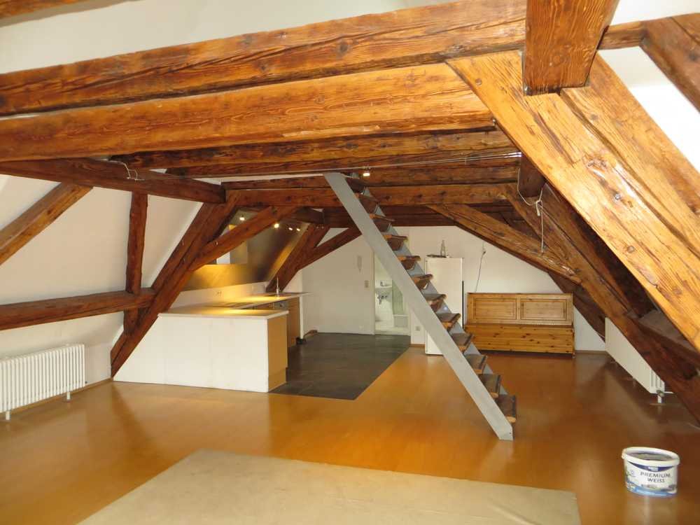 2,5 Zimmer-Galerie-Wohnung in der Stadtmitte von Kirchheim-Teck, in einem sehr schönen, historischem Fachwerkhaus, mit Aufzug bis zur Wohnungstüre. Von dort muss man 1 Treppe nach oben, in das Wohngeschoss. Hier befindet sich ein großzügiger, offener Wohn/-Küchenbereich mit Einbauküche, Öl-Schieferboden im Küchenbereich, ansonsten Buche Parkett. In der Wohnung ist eine schöne Fachwerkoptik mit Sichtgebälk. Hohe Räume, angenehme Wohnatmosphäre. Auf dieser Etage befindet sich noch das Schlafzimmer und das Tageslichtbad mit Dusche, Badewanne, WC und Waschmaschinenanschluss. Das Wasser wird über einen Elektroboiler erhitzt. Eine Treppe führt zur Galerie unters Dach. Von dort gelangt man auf den überdachten Südbalkon mit schönem Blick zur schwäbischen Alb und der Burg Teck. Die Wohnung soll an Nichtraucher vermietet werden. Haustiere sind nicht gestattet.