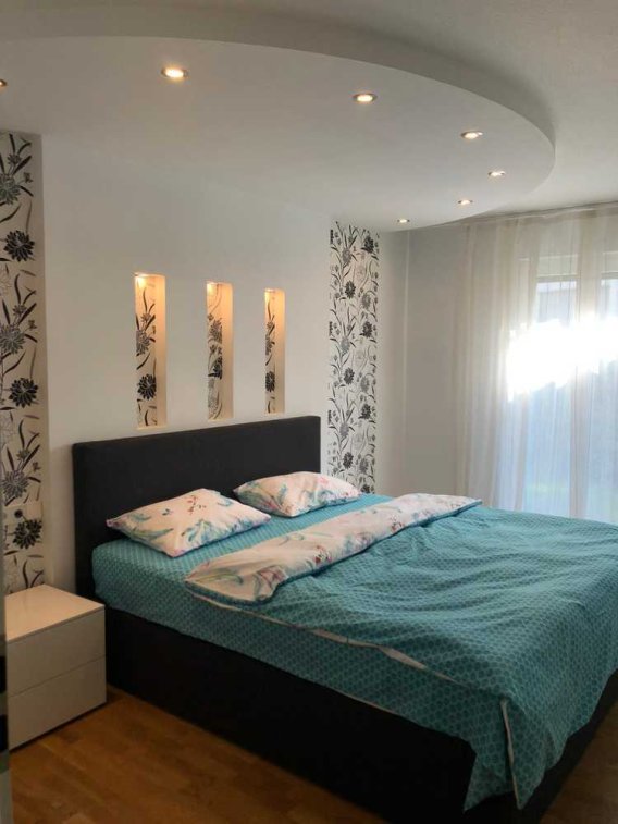 Zur Wohnung gehören außerdem eine Einbauküche sowie ein Tiefgaragenstellplatz (25 € monatlich). Miete ins gesamt 1215 Eur zzgl. Strom und Internet.