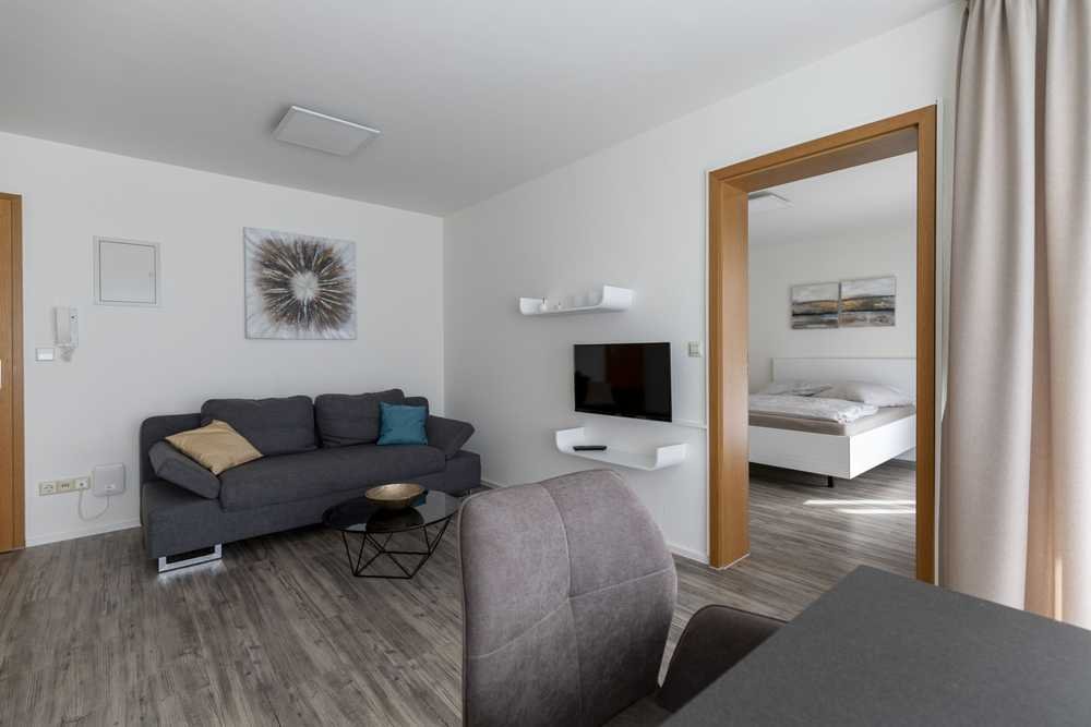 - Wohnzimmer mit Couch, TV, Esstisch und Stühlen