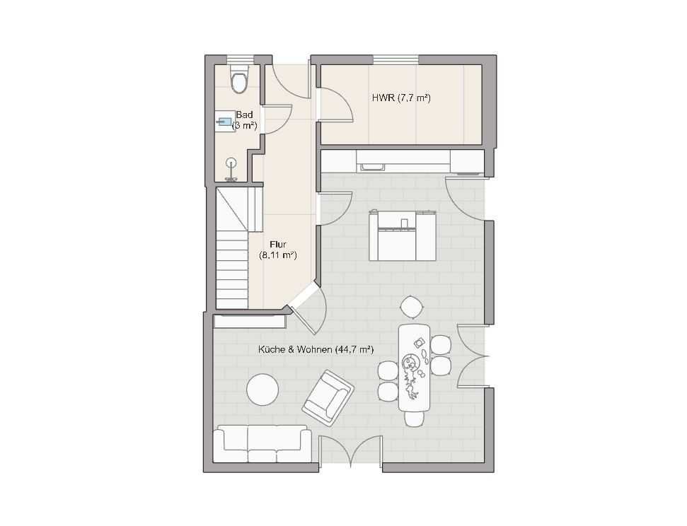 • Erdgeschoss: Heller, offener Wohn- und Essbereich mit moderner Küche und Zugang zum Garten, Gäste-WC, Hauswirtschaftsraum
