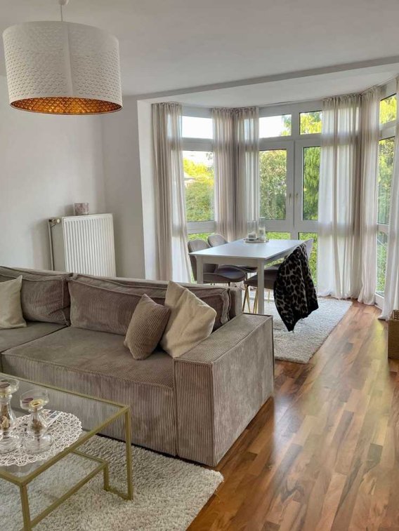Diese schöne Wohnung im 1. OG hat ein großzügiges Wohnzimmer mit sonnigem Erker und kleinem Balkon. Hier ist Platz für die gemütliche Sitzecke und einen Esstisch.