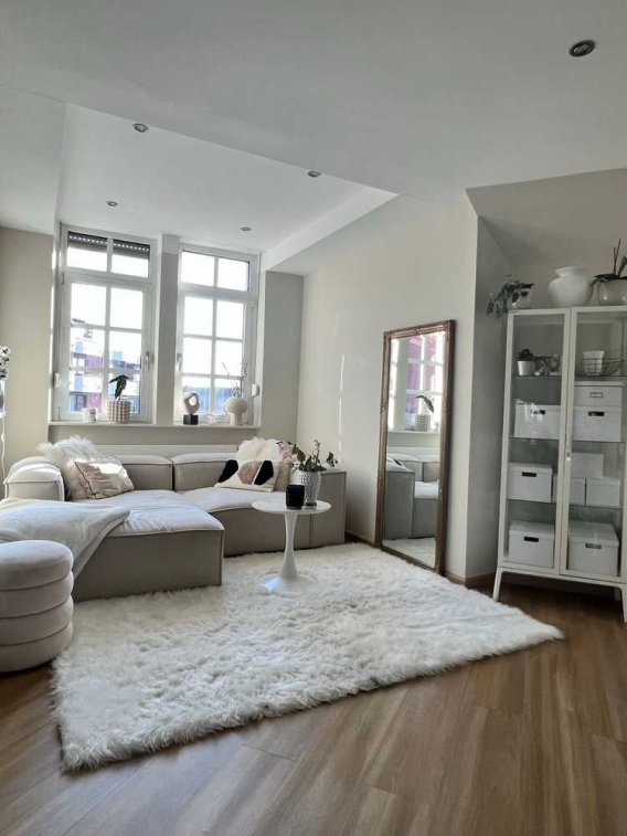 Die Wohnung eines Altbaus liegt im Zentrum von Landau. Über einen Aufzug kommen sie in den zweiten Stock. Beim Eintritt gelangen sie in den großen Wohnbereich. Der Vinylboden in Holzoptik und die Altbaufenster stechen einem direkt ins Auge.