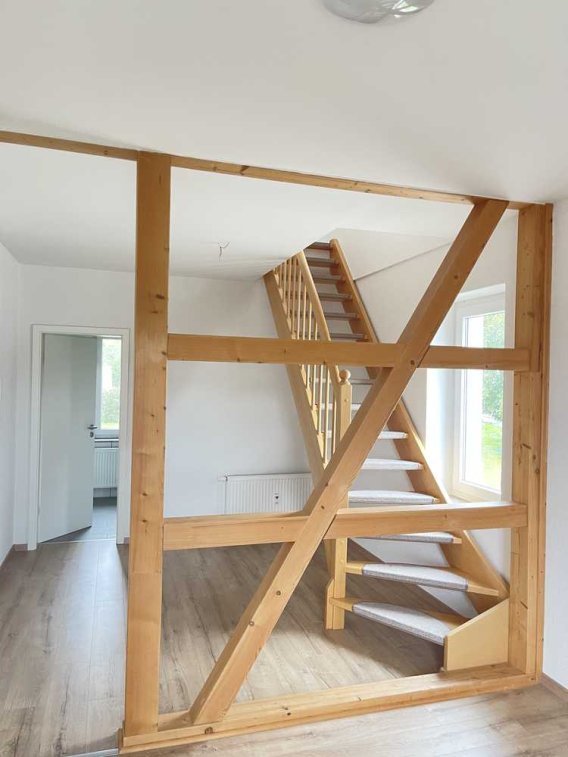 Der helle Wohnbereich mit integrierter Kochnische bildet das Herzstück der Wohnung. Sichtbare Holzbalken verleihen dem Raum eine wohnliche Atmosphäre mit rustikalem Flair. Über eine interne Treppe gelangt man ins Dachzimmer, das sich flexibel als Arbeits-, Gäste- oder Hobbyraum nutzen lässt.