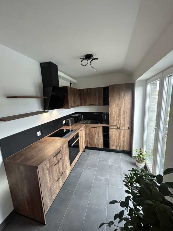 Inkludiert sind ein Induktionskochfeld, Backofen, Spülmaschine, Kühlschrank, Gefrierschrank, Dunstabzugshaube mit Abluft, eine Spüle inklusive herausziehbarem Wasserhahn, ein Mülltrennsystem, sowie ein eingebauter Besteckkasten.