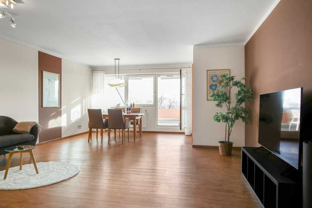 Auf der ca. 13,5 qm großen Sonnenterrasse (ca. 1/2 in Wohnfläche eingerechnet)haben Sie einen unvergleichlichen und unverbaubaren Blick. An besonders klaren Tagen sind sogar die Berge zu sehen.