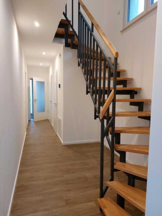 Im Erdgeschoss werden Fliesen im Holzdesign verlegt, welche nicht nur optisch sondern auch technisch eine wohlige Wärme mittels Fußbodenheizung erzeugen. Im Obergeschoss haben wir uns für einen plfegeleichten Vinylbelag entschieden. Das Haus wird durch eine Luftwärmepumpe beheizt und verfügt außerdem über ein zentrales Lüftungssystem. Sowohl im Erdgeschoss als auch im Obergeschoss gibt es ein WC mit Dusche bzw. Wanne. Die Bäder sind voll ausgestattet, d.h. Waschtisch mit Unterschrank und Spiegelschrank sind bereits vorhanden.