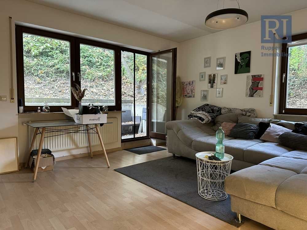 Vom Wohn- und Essbereich aus hat man Zugang zur Terrasse, die aufgrund der Hanglage ebenerdig liegt. Sie bietet viel Privatsphäre und lädt zu entspannten Sommerabenden mit Freunden ein.