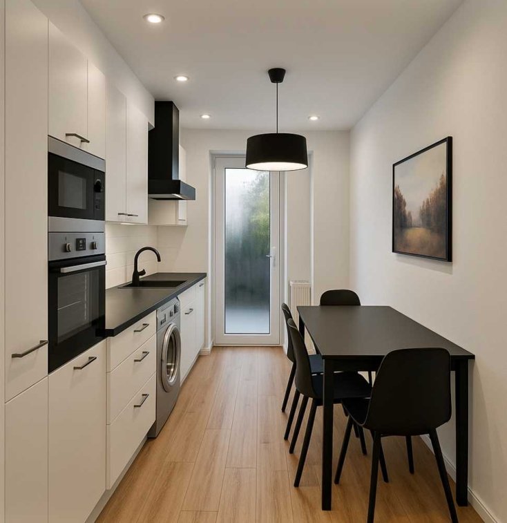 Die Wohnung ist komplett neuwertig und hochwertig renoviert sowie mit einer hochwertigen Einbauküche ausgestattet. Ein Esstisch, Stühle und eine Waschmaschine sind ebenfalls vorhanden.
