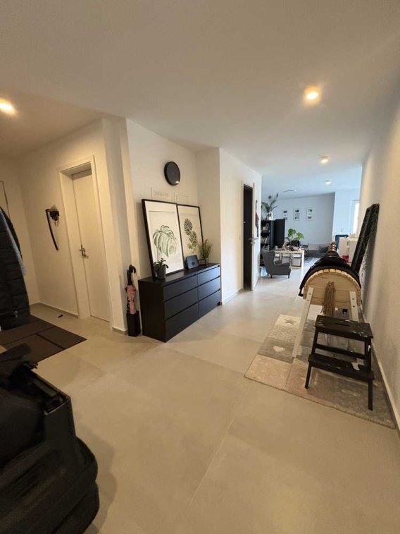 - es wurden moderne großformatige Fliesen 120 x 60 in heller Betonoptik in allen Räumen verlegt