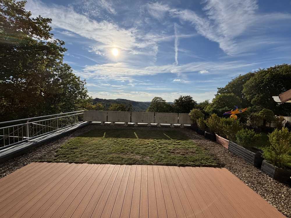 Die 50 qm große Terrasse besteht zu Hälfte aus einem ebenfalls frisch renovierten befestigten Bereich und zur anderen Hälfte aus einer Grünfläche. Dabei kann der befestigte Bereich komplett mit einer vor dem Wohnzimmer angebrachten Markise überzogen werden.
