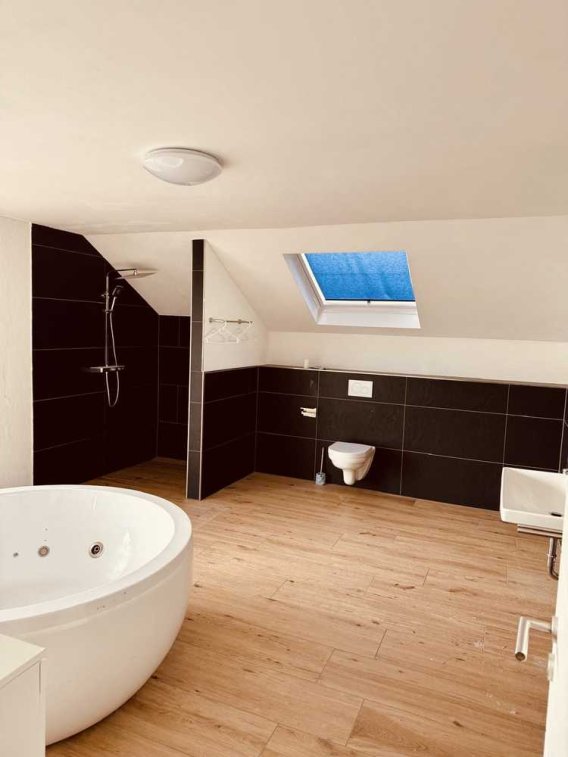 Masterbad mit Regendusche und Whirlpool Badewanne freistehend rund