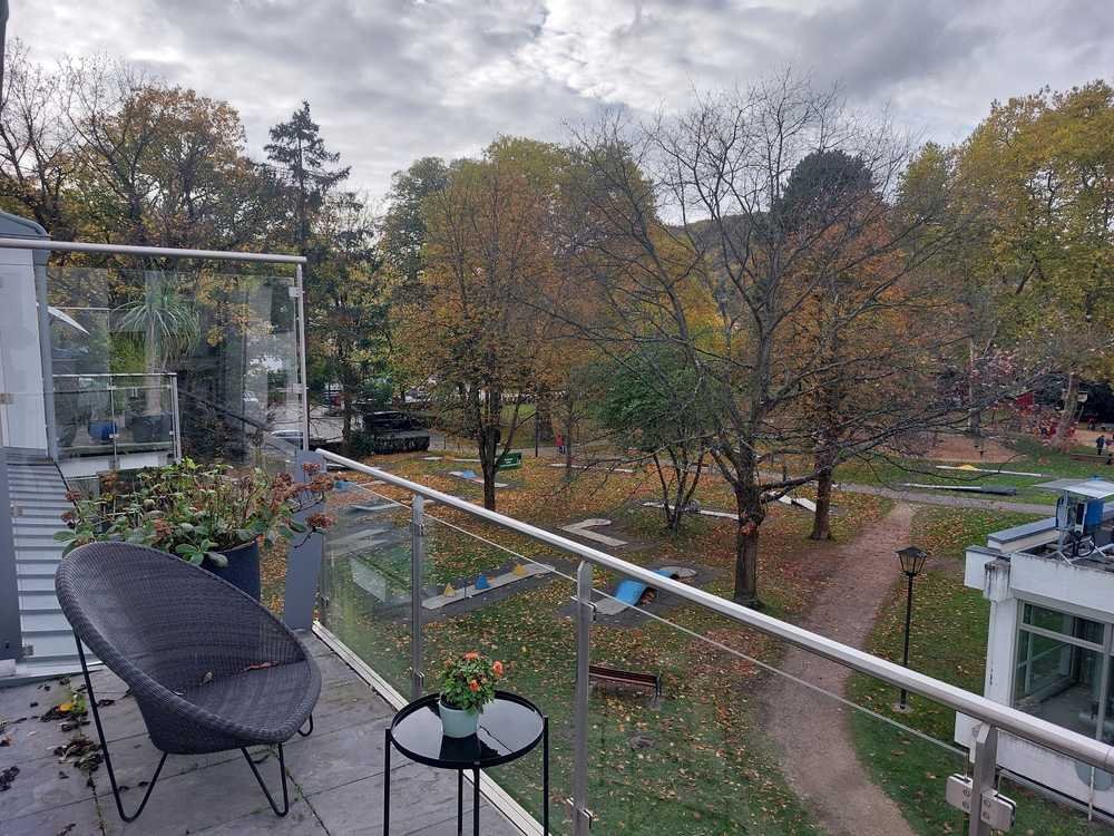 Glasfront und die angrenzende Terrasse einen Blick auf den Rhein sowie den angrenzenden Kurpark