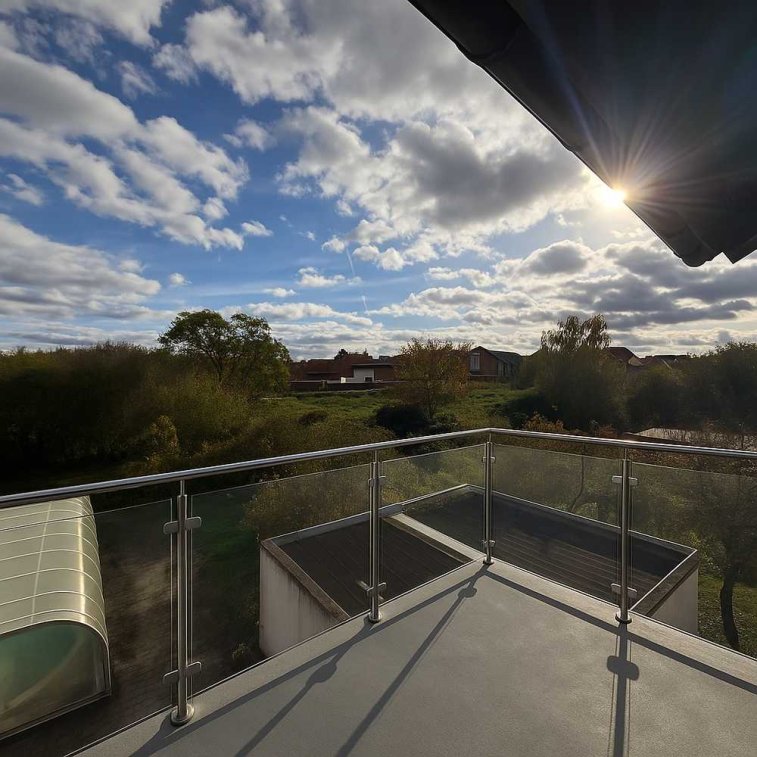 Der großzügige Wohn- / Essbereich führt auf den Balkon mit Glasgeländer – von hier genießt man eine weite, unverbaute Aussicht über die Dächer Bobenheim-Roxheims.