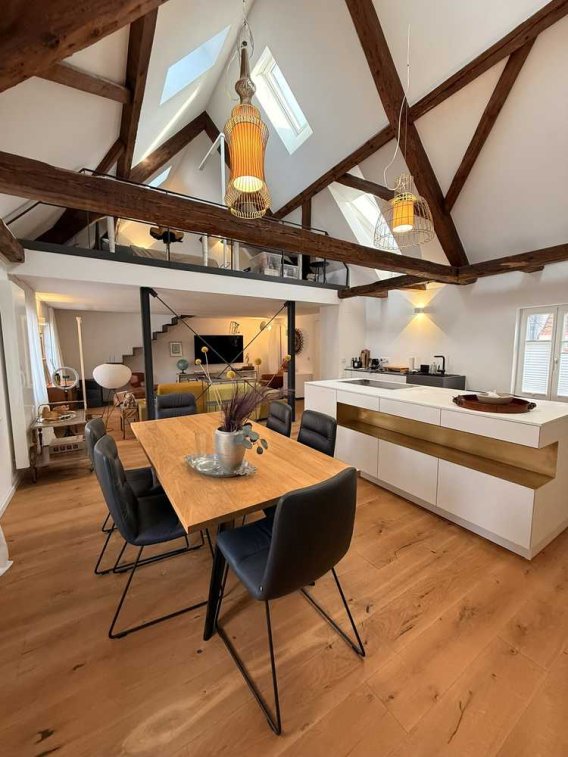 # Großzügiger Wohn- und Essbereich mit offener, hochwertiger Einbauküche, freigelegten Holzbalken und beeindruckender Raumhöhe. Die Kombination aus modernen Materialien und historischen Elementen schafft ein einzigartiges Loft-Ambiente.