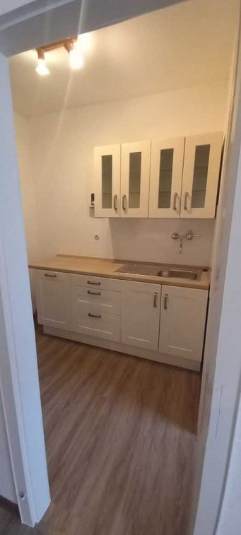 Vom Eingangsbereich aus erreicht man die kleine Küche. Diese ist bereits mit einer modernen, hellen Einbauküche ausgestattet.