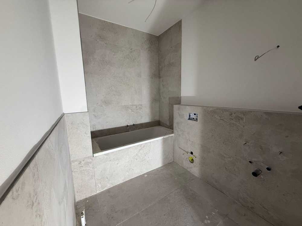 Das moderne Duschbad präsentiert sich in zeitlosem Design mit hochwertigen Sanitärobjekten, neuen Fliesen und einer Dusche.